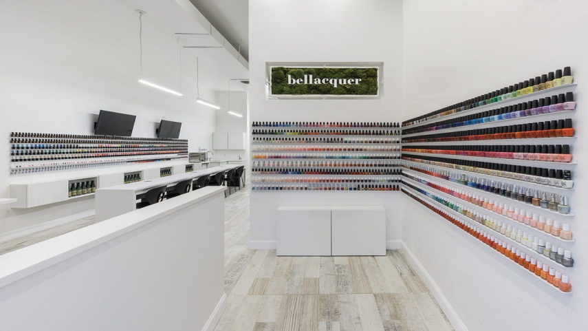 Bellacquer nằm ở Coolidge Corner - một khu vực đa dạng và vô cùng sôi động của Brookline, Massachusetts. Về vị trí, Bellacquer Nail Studio nằm ngay vùng trung tâm Boston với cư dân gồm nhiều thành phần khác nhau như sinh viên, các nhân viên trẻ tuổi và nhiều hộ gia đình. Về tổng thể thì vị trí này rất thuận lợi cho việc kinh doanh salon nail. Salon được thiết kế với những màu sắc đơn giản nhưng vô cùng trang nhã. Để không làm những bức tường trắng trông quá đơn điệu, một bộ sưu tập sơn móng hoành tráng và đa dạng về màu sắc đã được “trưng bày” vô cùng tinh tế. Đá thạch anh trắng được sử dụng trong nhiều khu vực làm việc cùng với sàn nhà được lót gạch Italia với hoa văn vân gỗ càng tạo nên một không gian sang trọng và đẳng cấp hơn.
