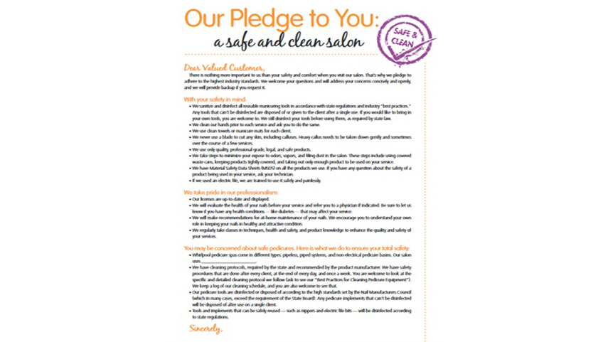 Bạn có thể phát cho khách hàng của mình các handout (thông tin về các tiêu chuẩn vệ sinh) trong quá trình thực hiện dịch vụ để họ có thể đọc và hỏi khi có bất kỳ thắc mắc nào, hoặc có thể để họ mang về nhà và đọc khi nào có thời gian rảnh. Để khách tự đọc ở nhà đôi khi lại có hiệu quả hơn là bạn cứ phải nói liên tục với họ khi đang chăm sóc móng mà họ cũng không để tâm được bao nhiêu. Bảng handout trên bao gồm nhiều nội dung cần thiết về các tiêu chuẩn vệ sinh của salon mà bạn có thể tự tải về và in cho khách của salon mình tìm hiểu.